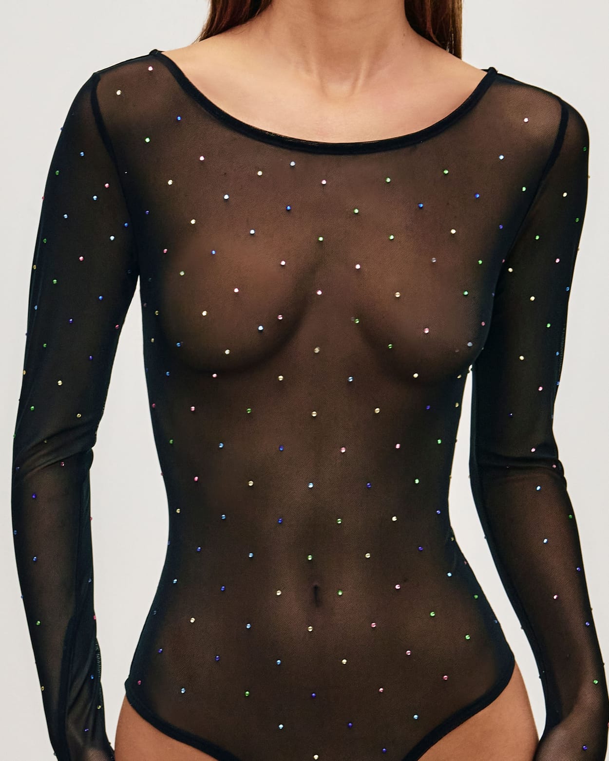 Long sleeve mesh and rhinestone bodysuit