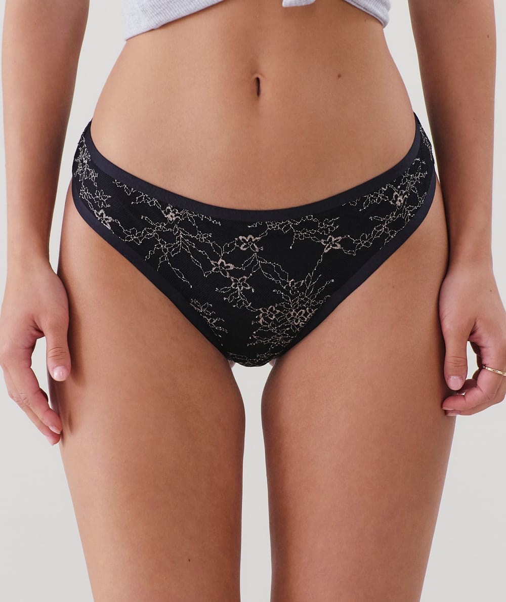 Fall for our MANONIZ period brief, which combines effective protection and style with its black lace enhanced with golde...