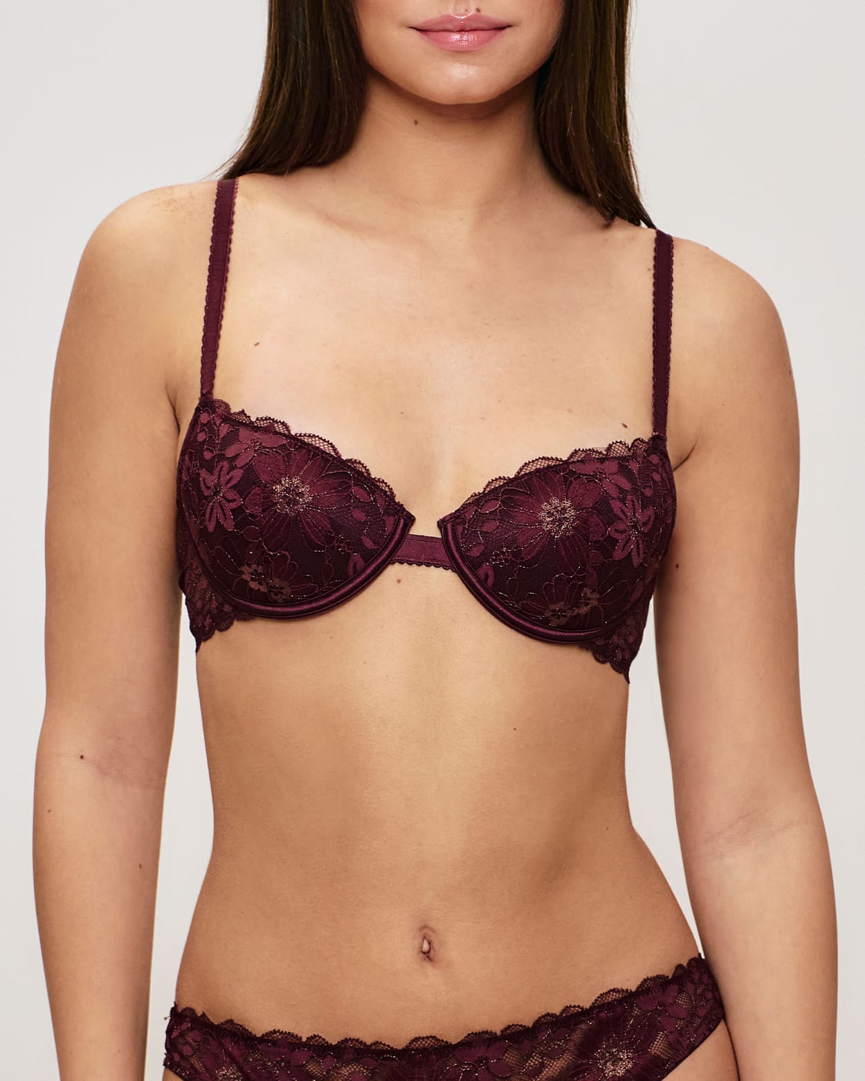 Fall for the CELENIZ LUREXIZ push-up bra, an elegant model in burgundy lace enhanced with a golden lurex thread that sub...