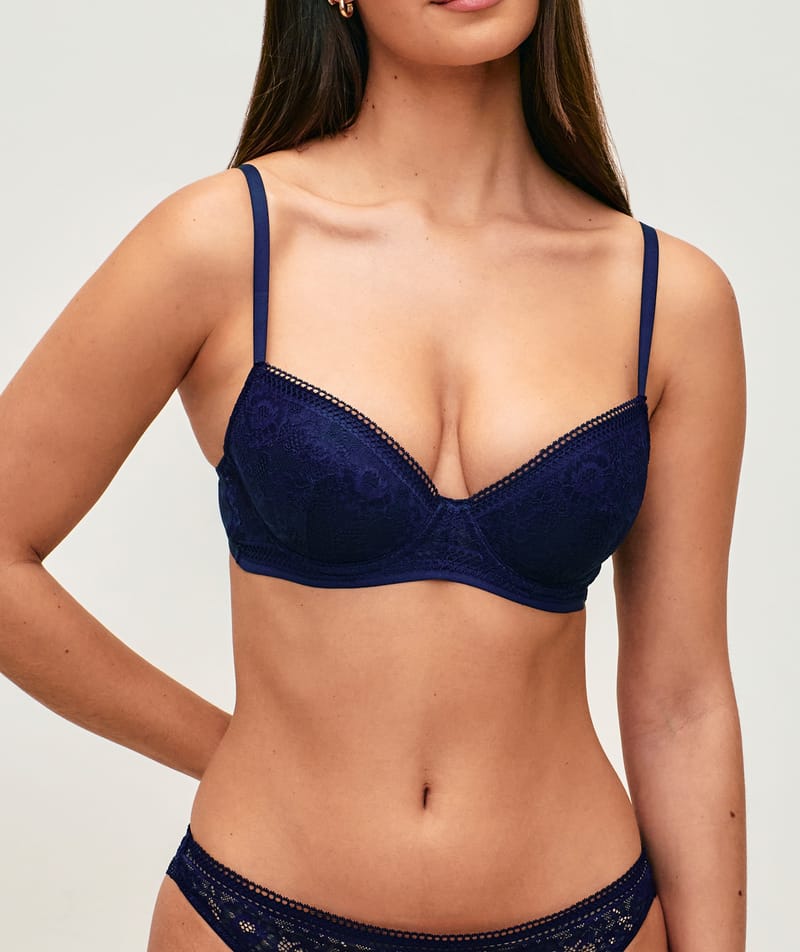 Fall for the NEW REVOLTIZ-AMPLI push-up bra, a navy blue must-have that enhances your silhouette. We love its floral lac...