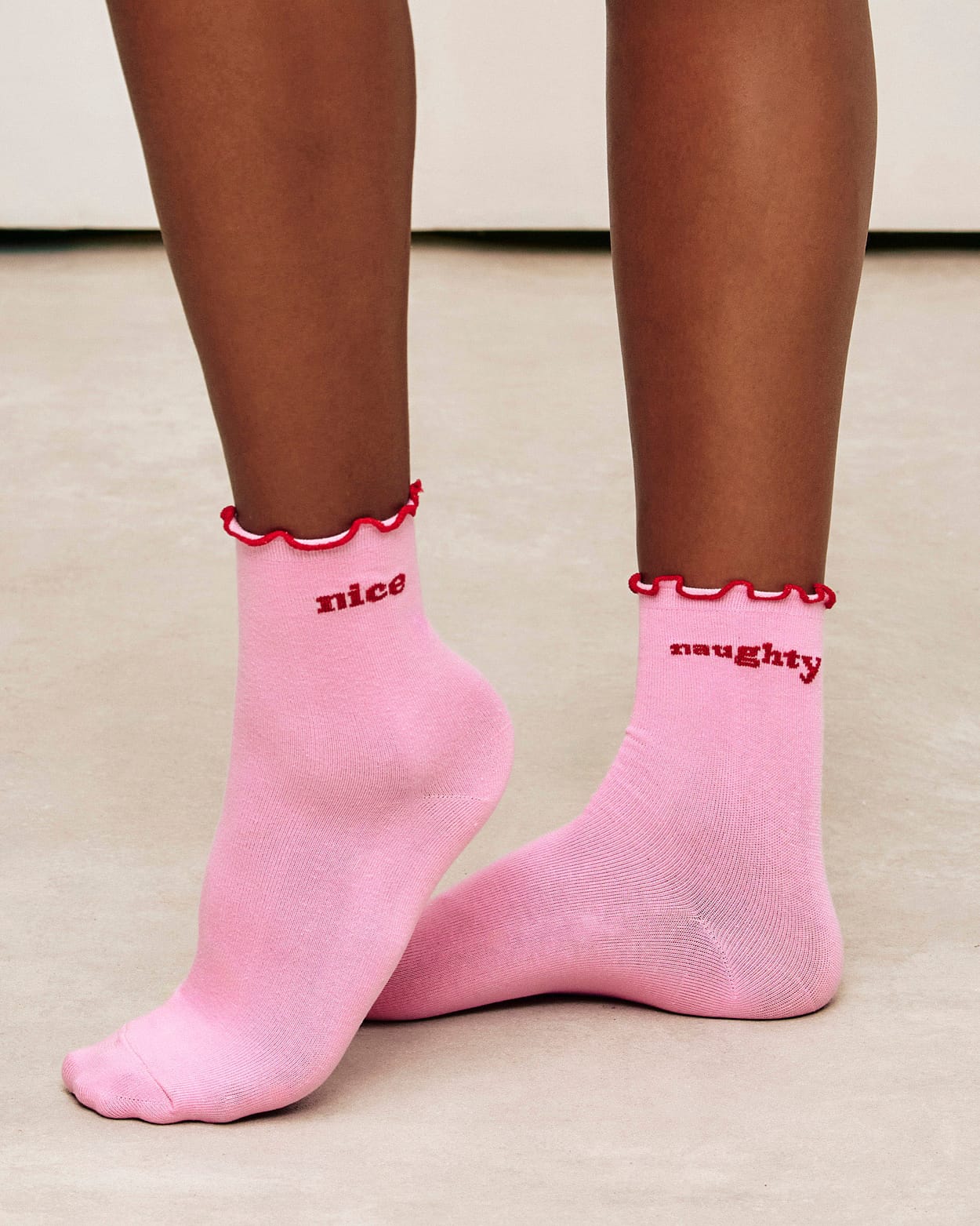 Fall for our NAUGHTYNICIZ-SOCKS message socks with their trendy lurex lettuce edge! These pink socks display the message...